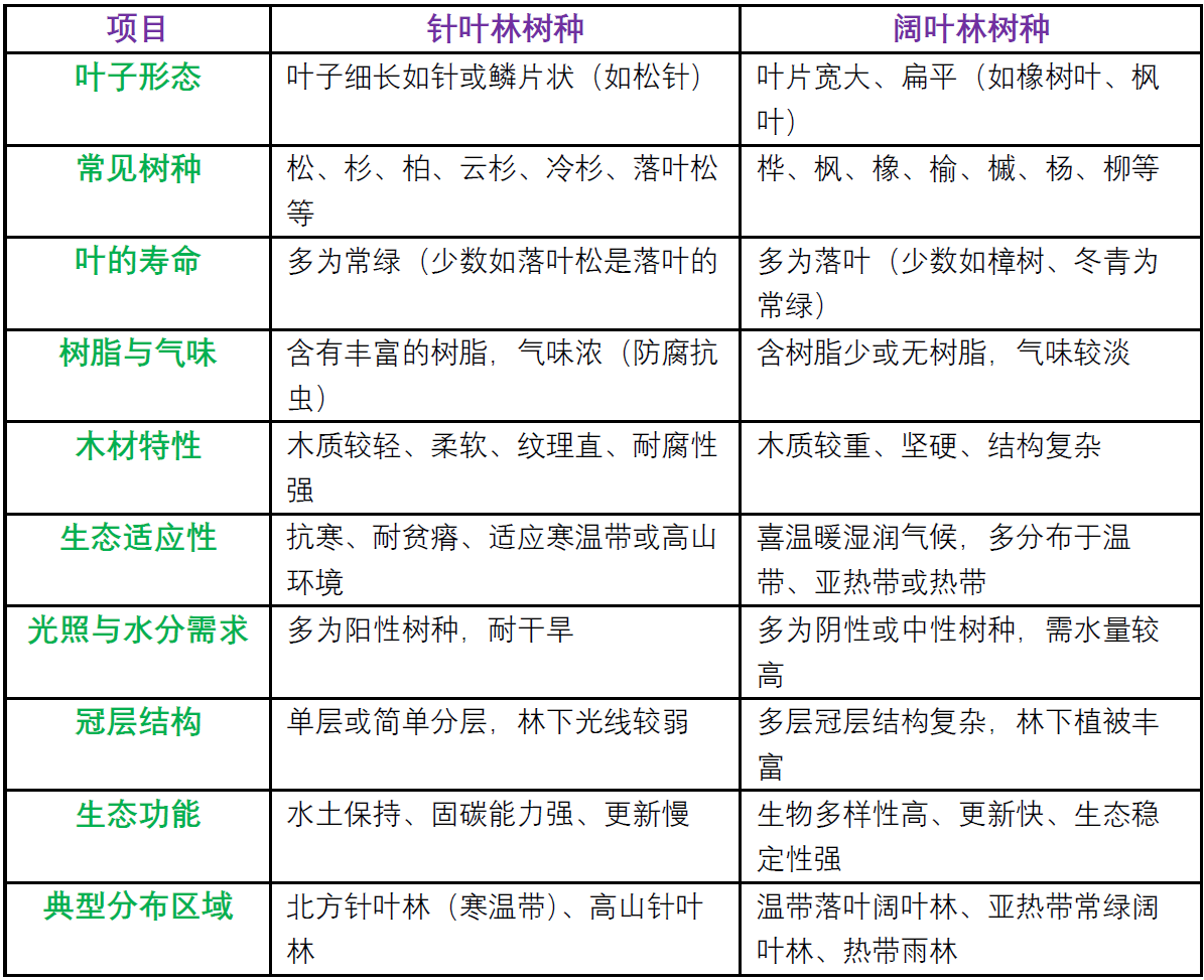 针叶林树种和阔叶林树种的区别主要体现在形态特征、生理特性、生态习性以及分布环境等方面。下面是一个系统对比表,帮助你更直观地理解: