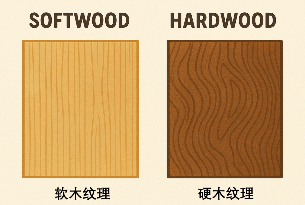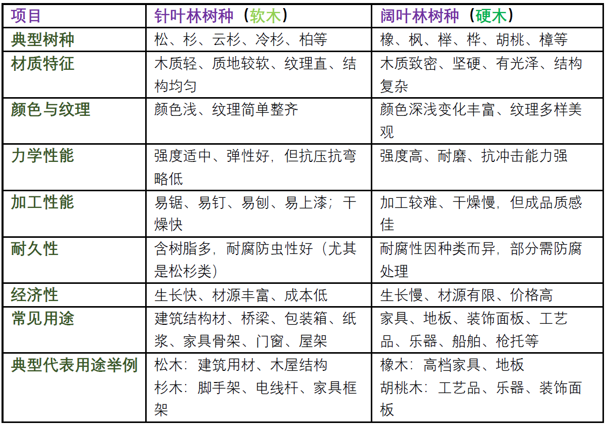 针叶林树种(软木)和阔叶林树种(硬木)在木材性质与用途上有显著区别,主要体现在密度、强度、纹理、加工性能、用途方向等方面。