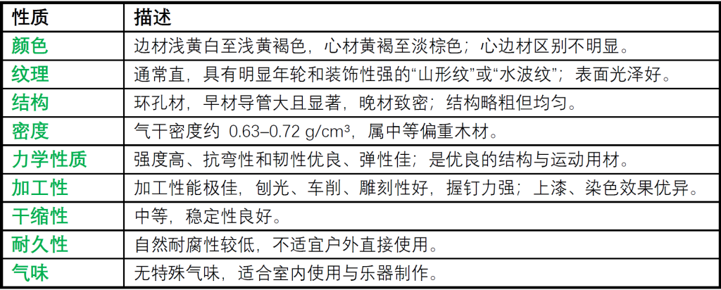水曲柳是一种质地坚韧、纹理优美、加工性能优异的东亚优质木材树种。相较于北美白蜡木,力学性能相近,但色泽更温润、加工性更佳,凭借其优良的力学性能与装饰效果,水曲柳长期被视为“东北最具代表性的硬阔叶木材”,在东亚市场中是白蜡木类家具的首选本地材料。但目前水曲柳:天然林资源稀缺,受保护限制,已列入中国《国家重点保护野生植物名录(二级)》。