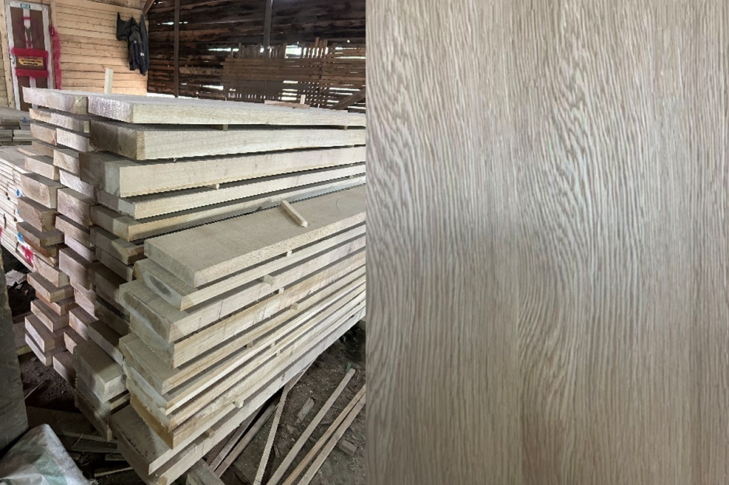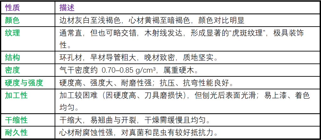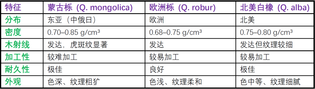 蒙古栎是东北阔叶林中最重要的硬木树种之一,是一种重硬、坚韧、耐久且装饰性强的东亚地区优质阔叶木材,因其高强度、耐久性和美观纹理,在全球市场中,蒙古栎常作为“Asian Oak(亚洲橡木)”出口,在木材工业中用途极为广泛,主要包括:1.家具制造:制作高档实木家具、桌椅、柜体、门窗等;纹理清晰、装饰感强,常用于模仿欧洲橡木风格;在中国、日本、俄罗斯常作为“本土橡木”使用。2.地板与建筑装饰:由于其耐磨性与强度高,是实木地板和复合地板的优质原料;也用于室内墙板、楼梯踏板、扶手、梁柱饰面,经热处理或蒸汽改性后可改善稳定性,防止翘裂。3.酒桶与容器:蒙古栎与欧洲橡木相似,导管结构与木射线发达,在东北、俄罗斯及日本,部分用于酒桶、发酵桶、酿酒储藏容器,其单宁含量高,可赋予酒液独特香气,但香气略显粗烈。4.工程与重载用途:因为强度高且抗冲击,被用于地枕木、桥梁、车辆底盘、造船构件等;在过去也常作铁路枕木、车轮、工具柄。5.工艺品与乐器部件:适用于雕刻工艺、装饰线条、车木制品,但因重量较大,较少用于乐器主体。