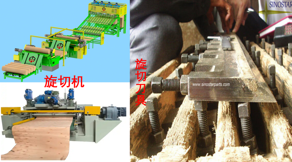 设备:旋切机(Rotary lathe / Peeling lathe),旋切刀具(Veneer knife),厚度控制装置(Knife gap control system)