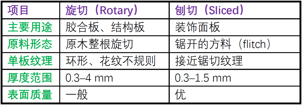 B. 刨切(Slicing)适用于: 装饰用单板(厚度 0.3~1.5 mm)